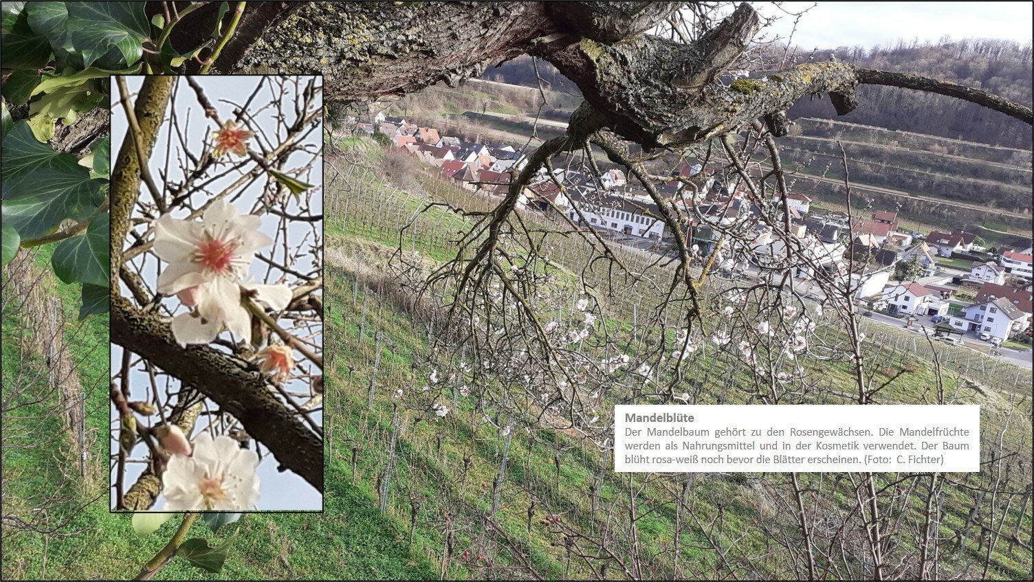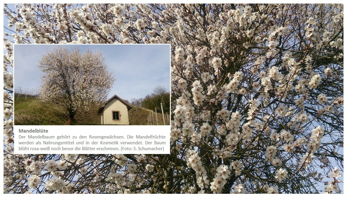 | Mandelbaumblüte | Je nach Verlauf des Winters ab Ende Febr. bis Anfang April | Vor allem in und um Oberrotweil, Achkarren und Ihringen |