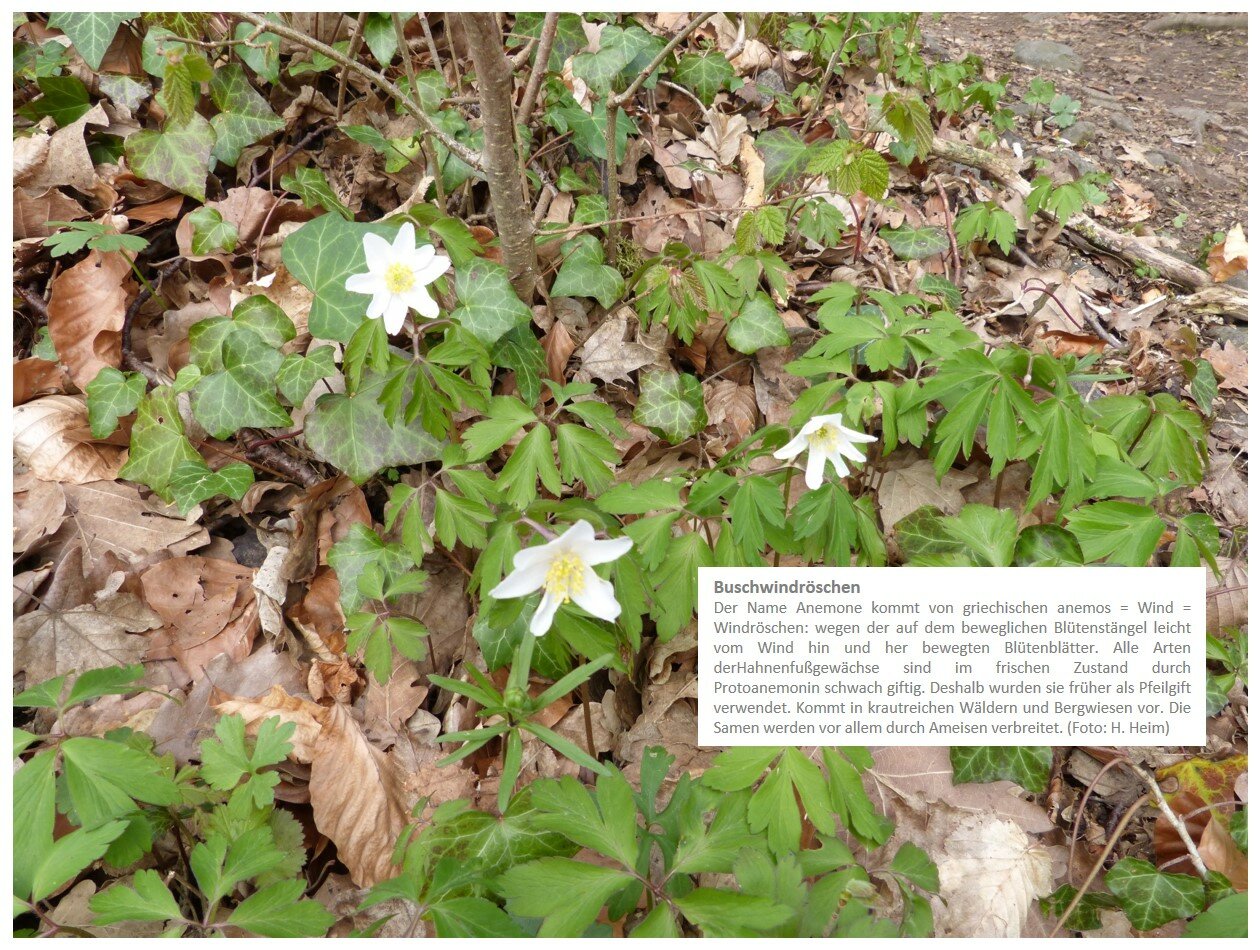 | Buschwindröschen-Blüte | März / April | Frühblüher auf dem Waldboden der Laubwälder, z.B. im Liliental u. rund um die Katharinenkapelle |